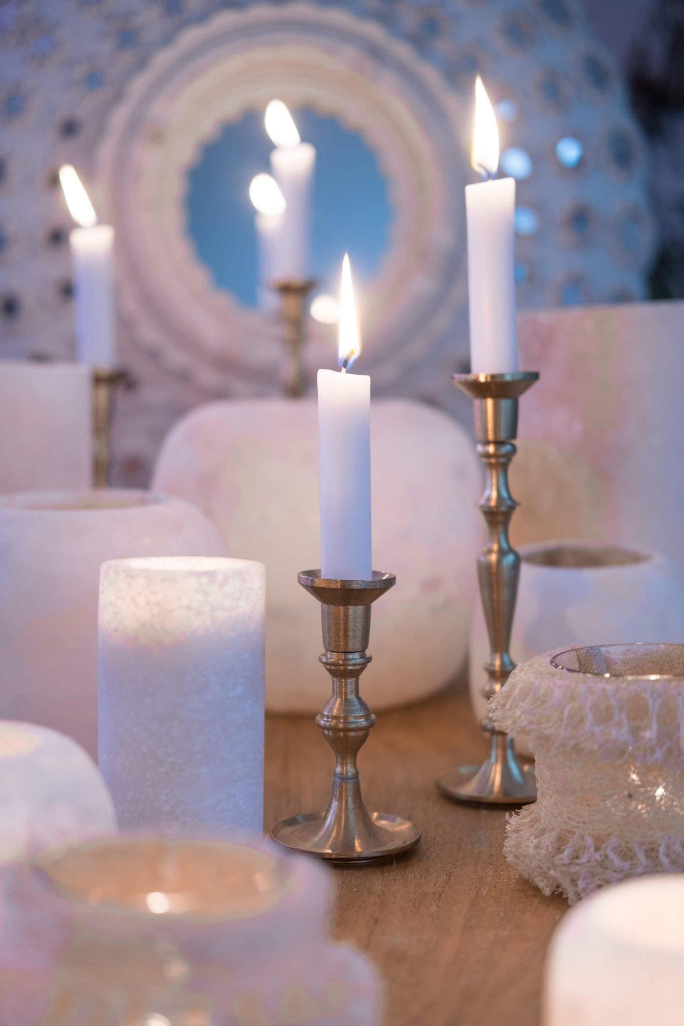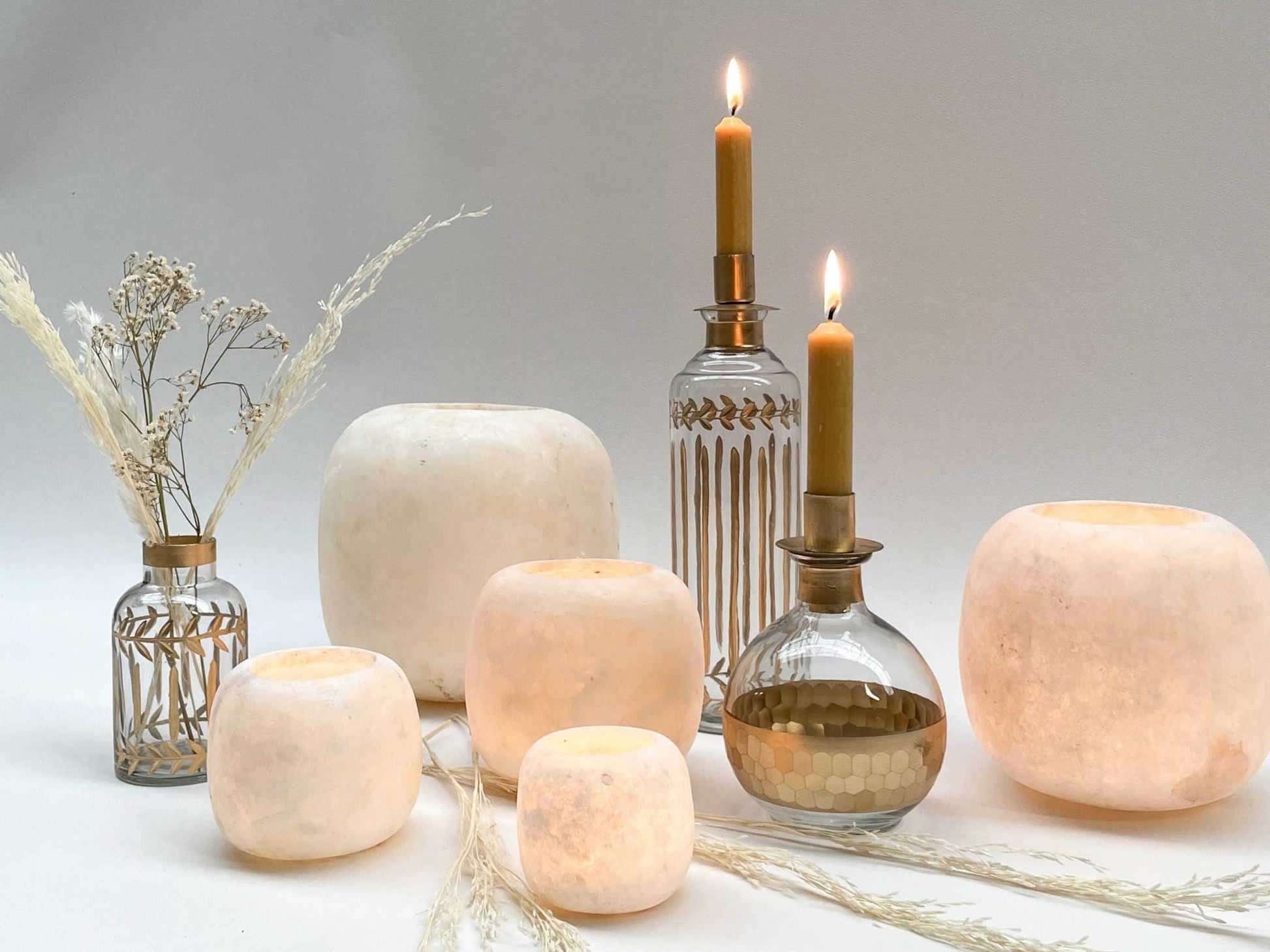 Local craftspeople still possess the skills to work with this stone. It's remarkable that this has been done for so many generations and thousands of years. The creamy white color is the perfect soft hue for a natural candlelight. Mix and match the different sizes for an attractive arrangement on your table. Alabaster is a porous stone, which is why candlelight shines through it so beautifully. However, melted candle wax can sometimes leak through the material, sticking to the surface. To be on the safe side, we therefore recommend placing a coaster under the tealight. PLEASE NOTE! Alabaster is a natural material, so the colors and light it produces may vary.