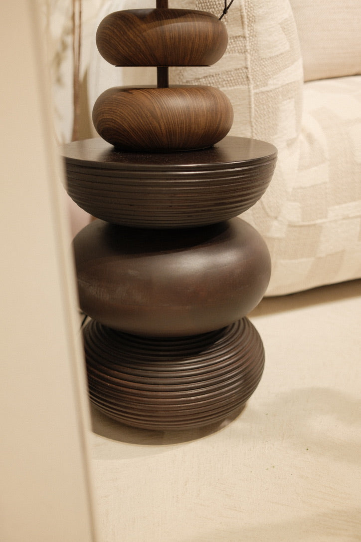 Round, robust, and tactile – the Sven side table is a statement piece in your interior. Made of eco-friendly mango wood with both smooth and polished sections, finished in a matte dark walnut color.