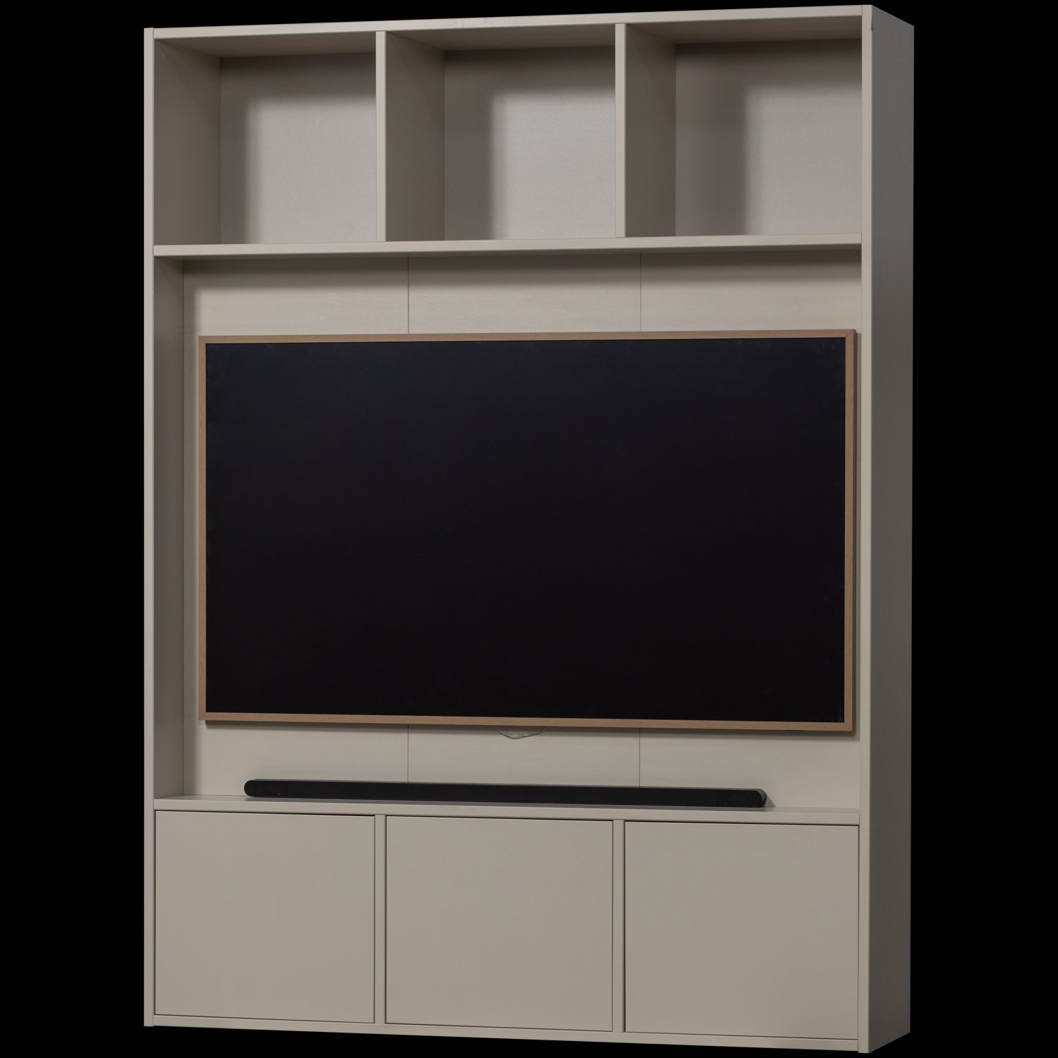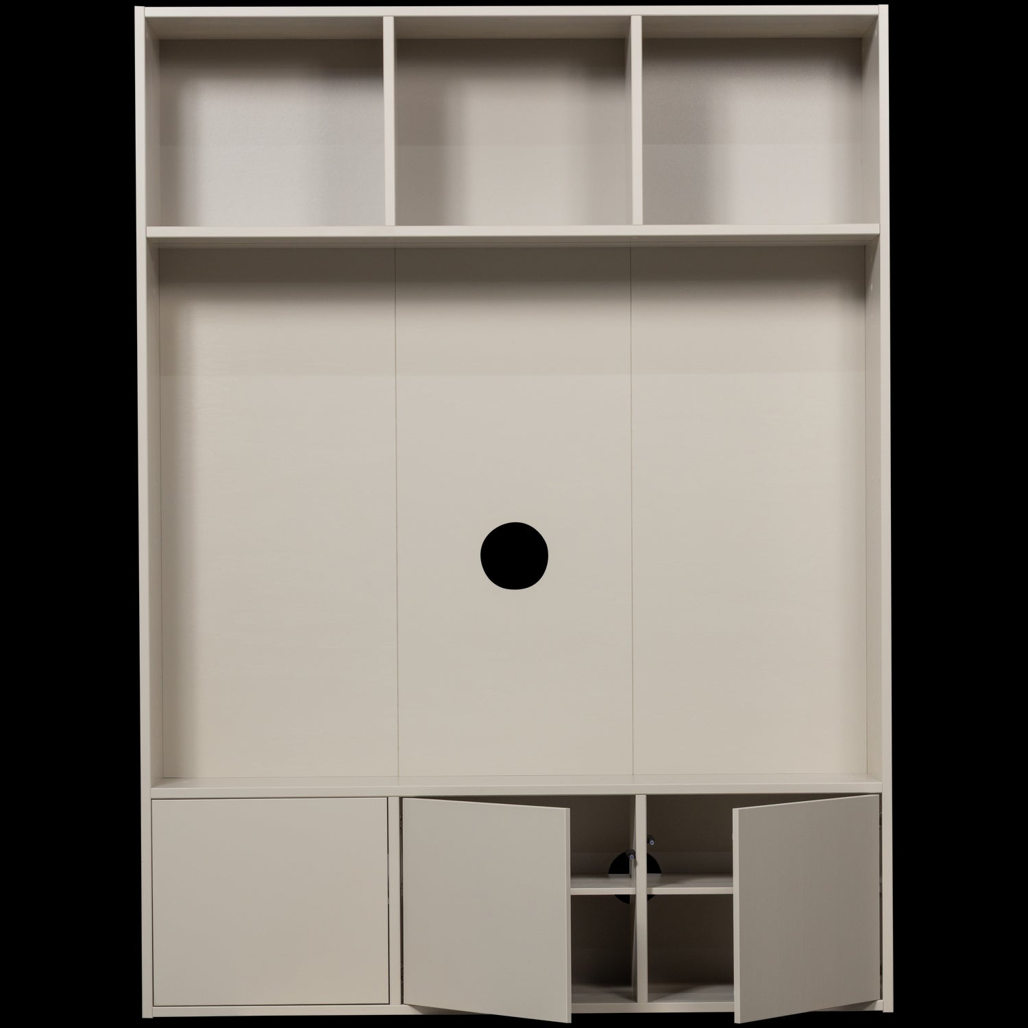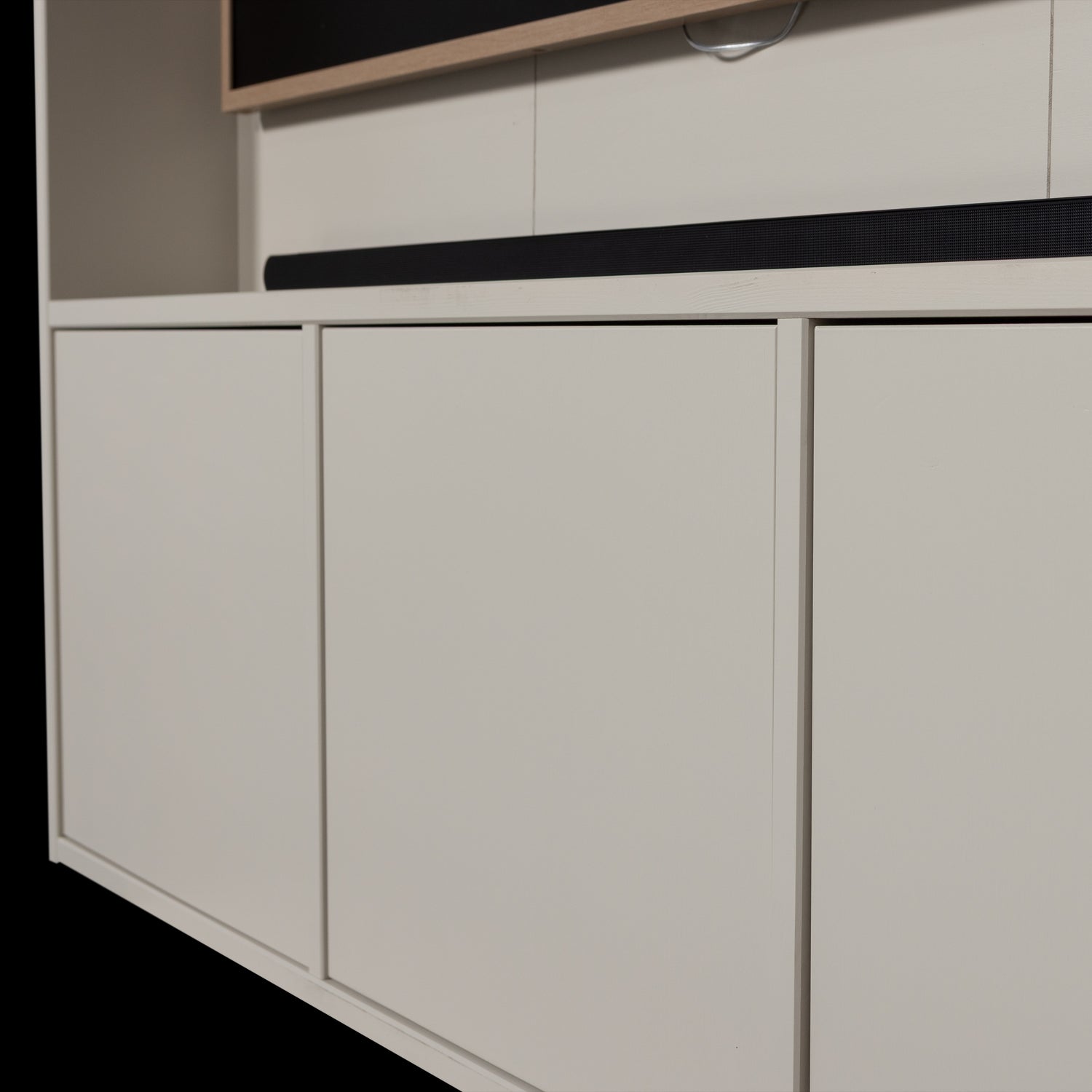 De Meggy tv opbergkast van WOOOD is een stijlvolle en royale kast, vervaardigd uit FSC-gecertificeerd grenenhout. Het ontwerp combineert functionaliteit met een modern uiterlijk. Bovenin bevinden zich open vakken om decoratie zichtbaar tentoon te stellen. Onderin zorgen deurtjes met een push-to-open systeem voor een nette opbergmogelijkheid. Het midden van de kast biedt ruimte voor je tv, waarbij de achterzijde op twee manieren gemonteerd kan worden, zodat je kunt kiezen tussen ophangen of neerzetten. De kast is te combineren met andere Meggy-elementen voor een complete kastenwand.