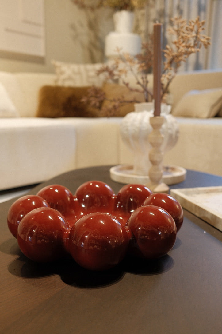 3D, extremely spherical design. Suitable as a serving bowl and decorative object. In dark red. High-gloss finish. Large bowl.