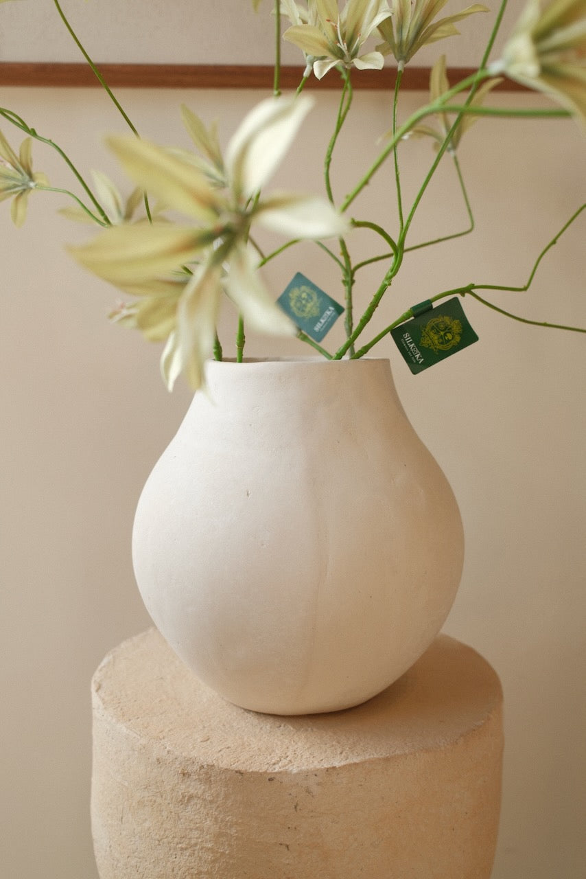 Deze decoratieve pot heeft een organische ronde vorm en is uitgevoerd in een zachte natuurlijke wit-tint, waardoor hij moeiteloos past binnen elke woonstijl — van minimalistisch en Scandinavisch tot modern en boho.