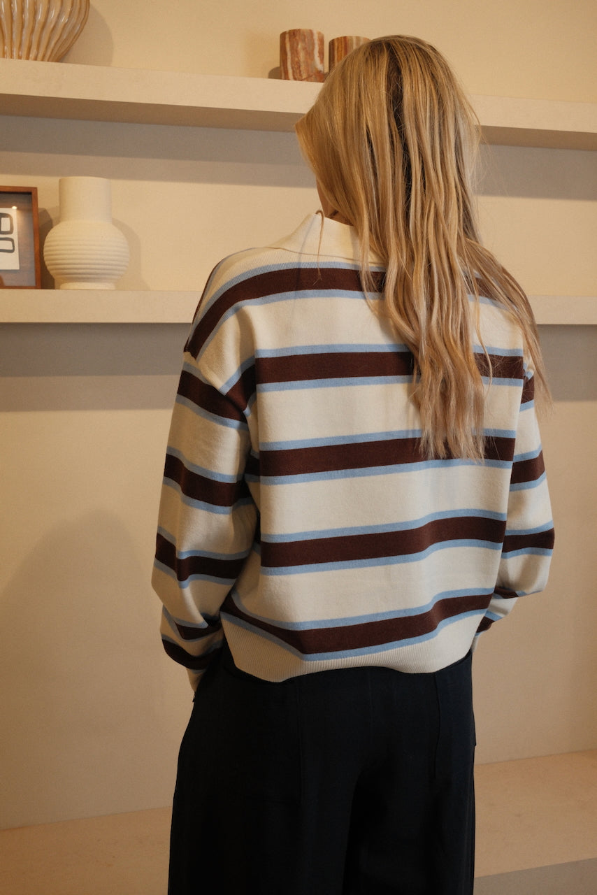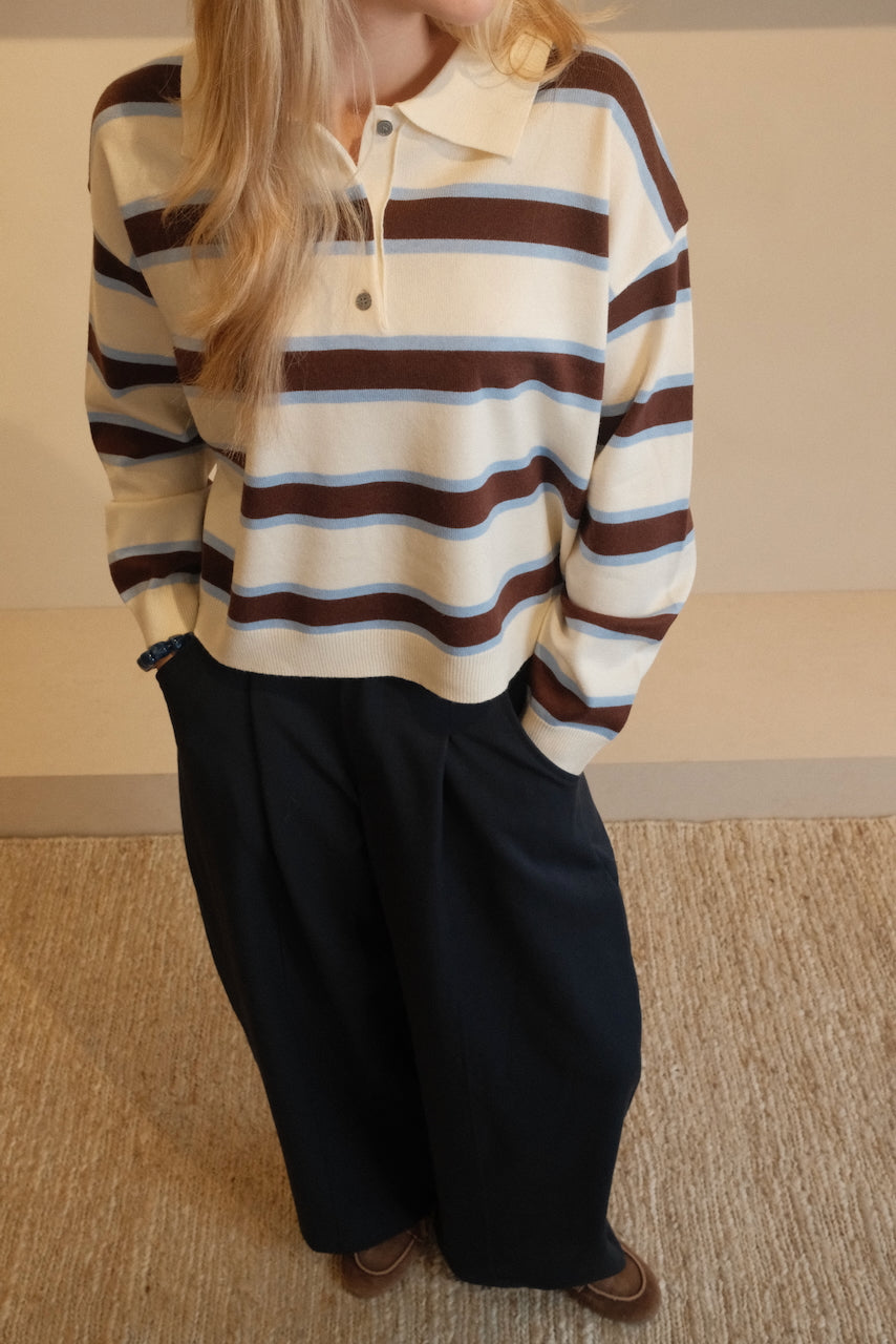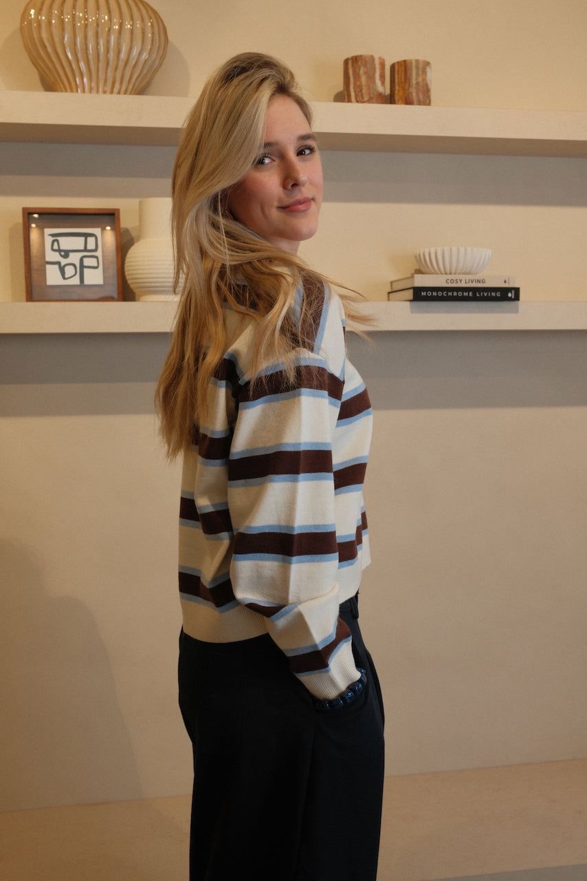 spring collection ’26 FORMA by LDE trui Benthe is een heerlijk draagbare trui met streepjes die in elke garderobe thuis hoort. Het tijdloze patroon geeft een frisse en moderne uitstraling. De trui voelt comfortabel aan en is perfect voor dagelijks gebruik. Makkelijk te combineren met zowel broeken als rokken. Een veelzijdige essential voor het voorjaar.