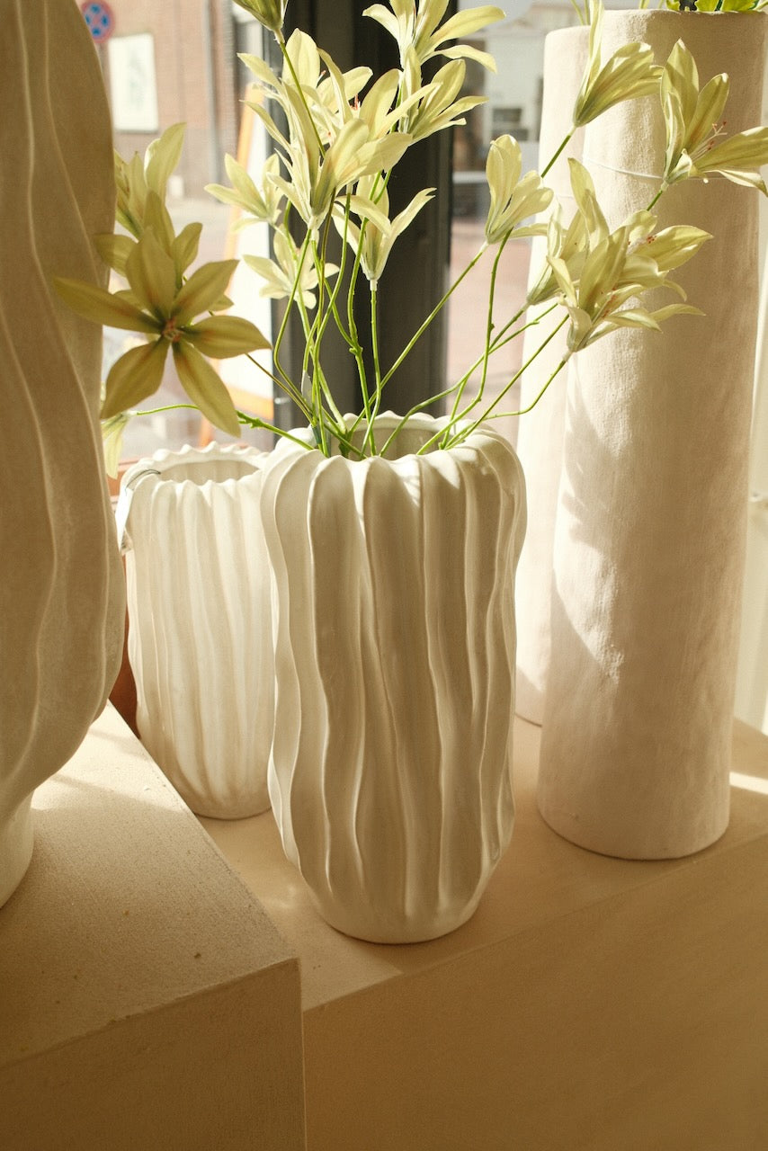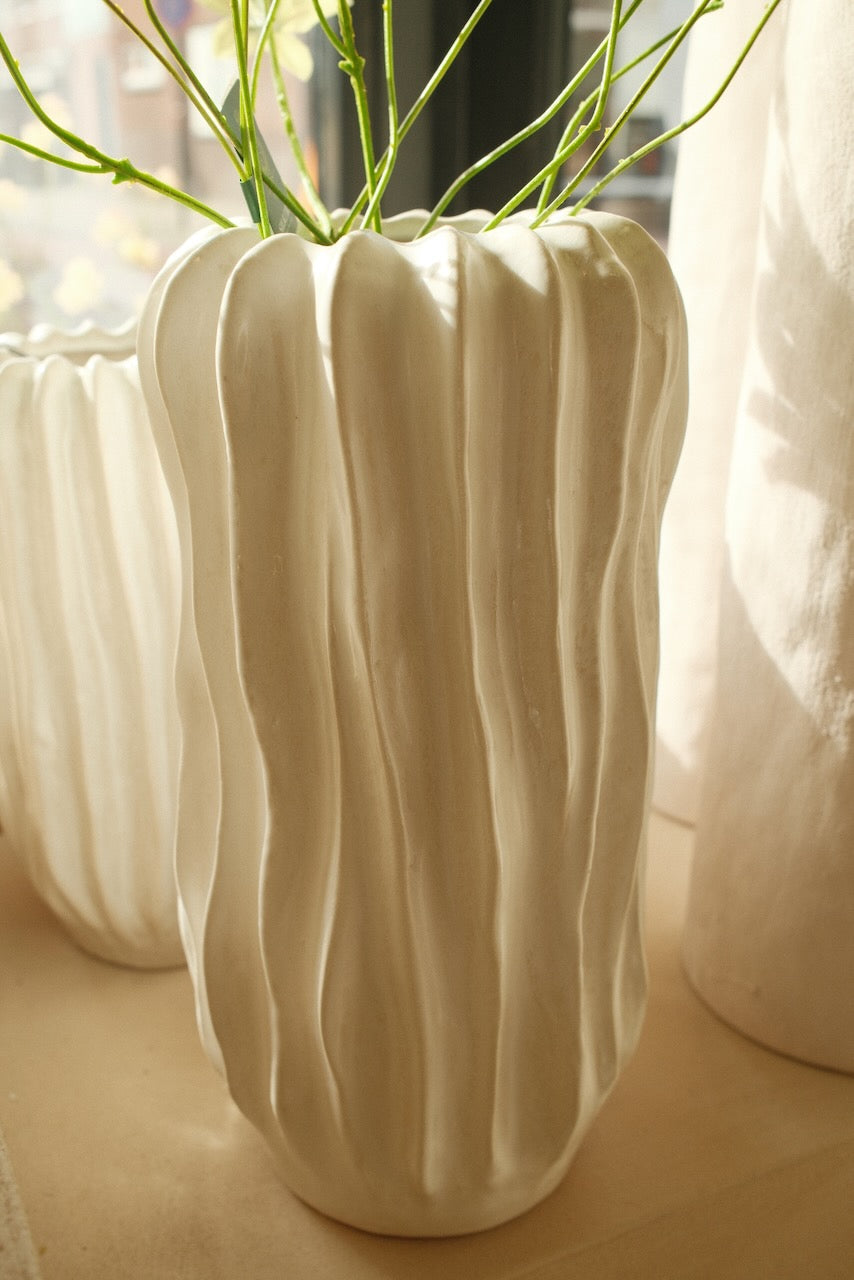 De Luna vaas in crème is een elegante en opvallende vaas met een rustige, natuurlijke uitstraling. Het keramische materiaal en de zachte crèmekleur geven de vaas een tijdloos karakter, waardoor hij moeiteloos past in zowel moderne als warme, sfeervolle interieurs.
