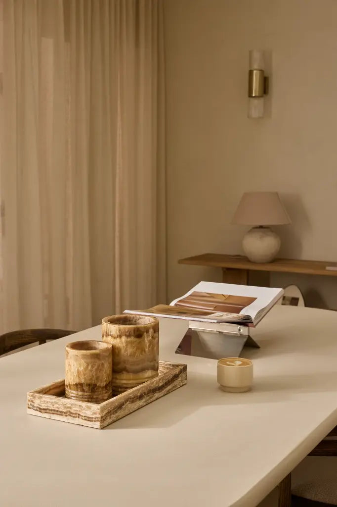 Wanneer er een waxinelichtje of kaars in brandt, laat het onyx een zacht en warm licht door, wat zorgt voor een rustige en uitnodigende sfeer in huis. Dankzij het middelgrote formaat is dit windlicht ideaal voor op een salontafel, dressoir of sidetable, en mooi te combineren met andere maten uit dezelfde serie.
