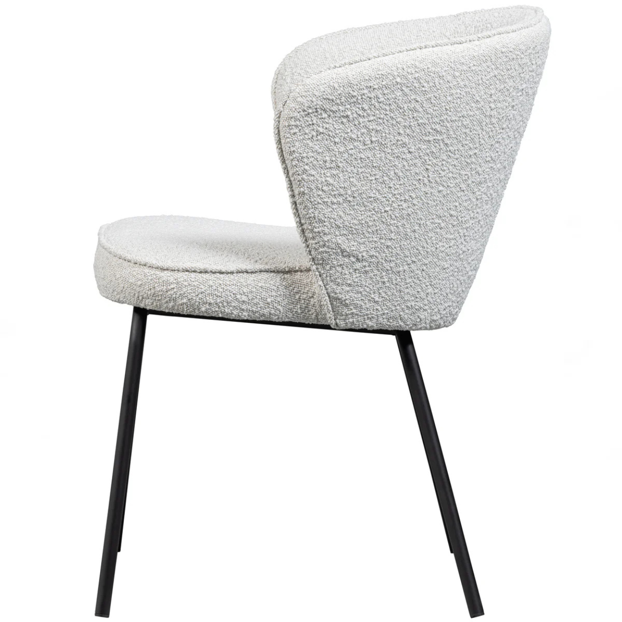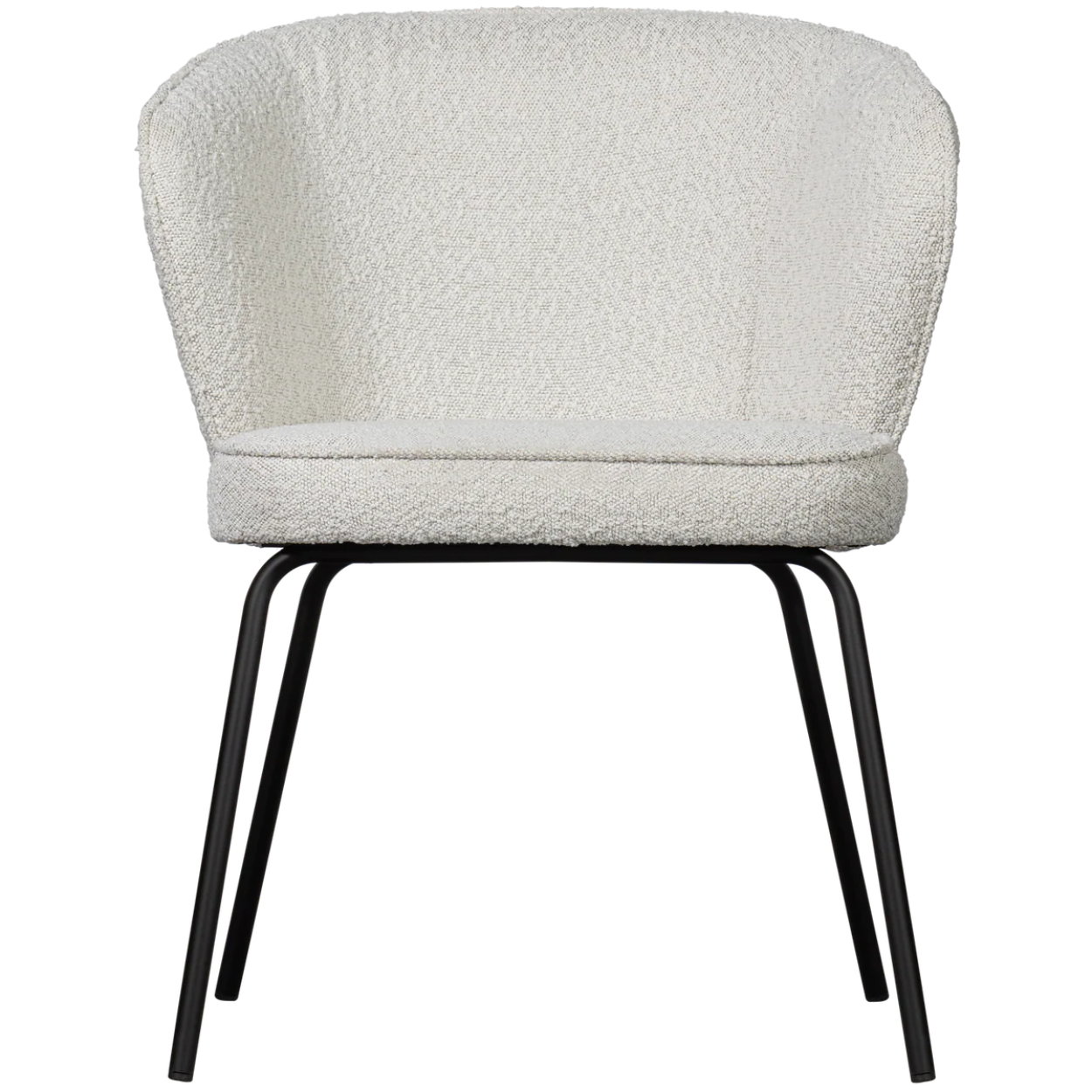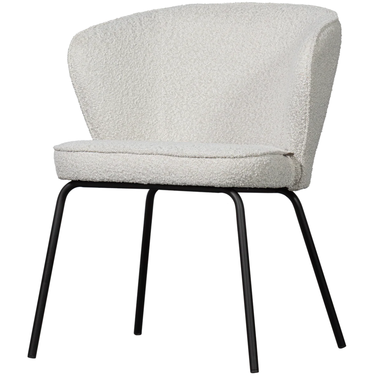 De eetkamerstoel is voorzien van een stevig, matzwart metalen onderstel en een zitgedeelte bekleed met Colmar boucle stof, gemaakt van 100% polyester. Deze stof is zacht, heeft een elegante textuur en brengt direct warmte in de ruimte. Met een Martindale-score van 100.000 is de boucle zeer geschikt voor intensief gebruik. De dichte weeftechniek maakt de stof sterk en slijtvast, terwijl de hoge kleurvastheid ervoor zorgt dat de stoel langdurig mooi blijft. Direct zonlicht wordt afgeraden om kleurverschillen te voorkomen.