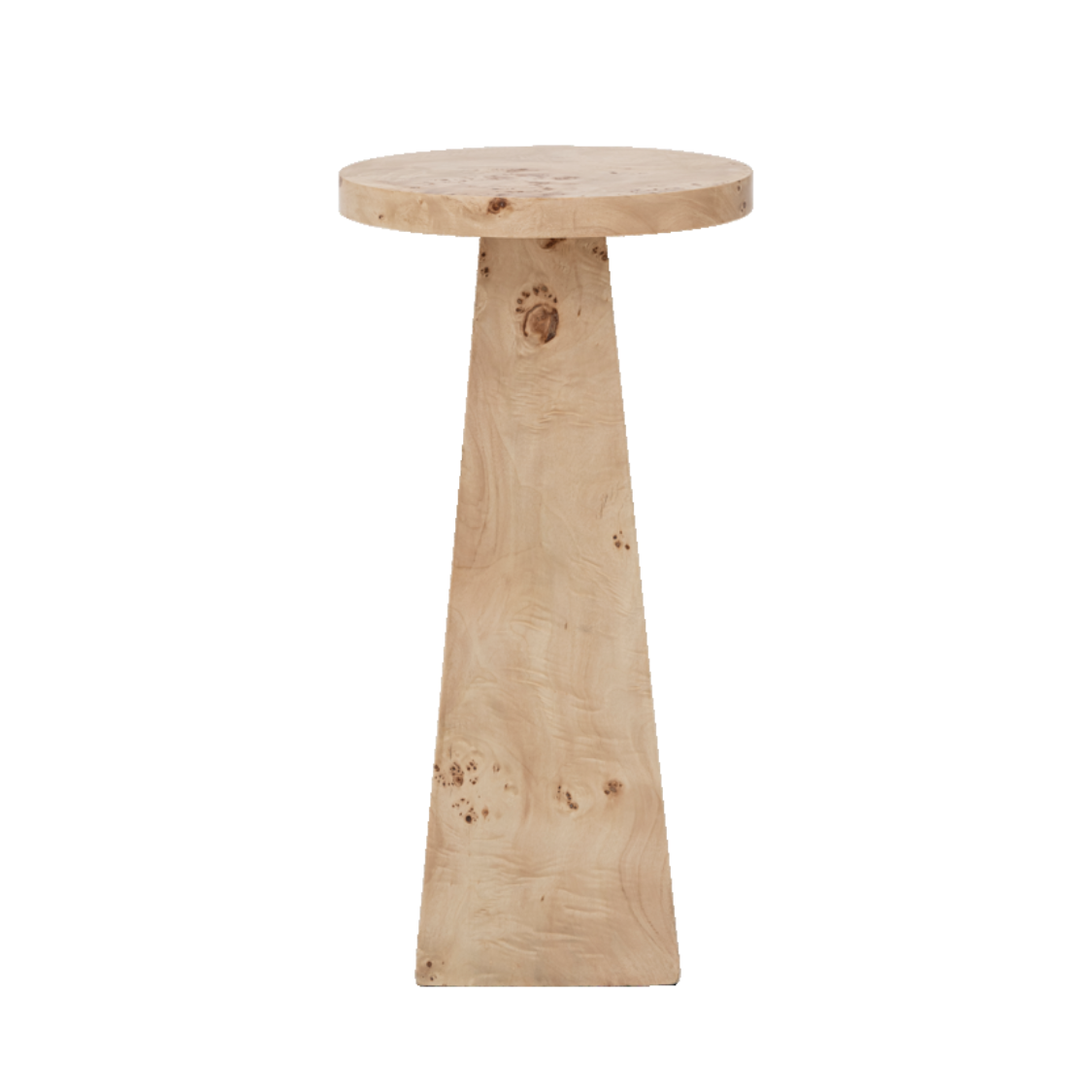 Nieuwe collectie Urban Nature Culture 2026. Deze bijzettafel van natuurlijk burlhout heeft een sculpturale uitstraling, met een taps toelopende driehoekige voet die zacht oploopt naar een glad tafelblad. Ontworpen om vorm en functie te verenigen, brengt hij een warme, aardse sfeer in je leefruimte. Een design dat elke ruimte voorziet van subtiele elegantie en karakter.