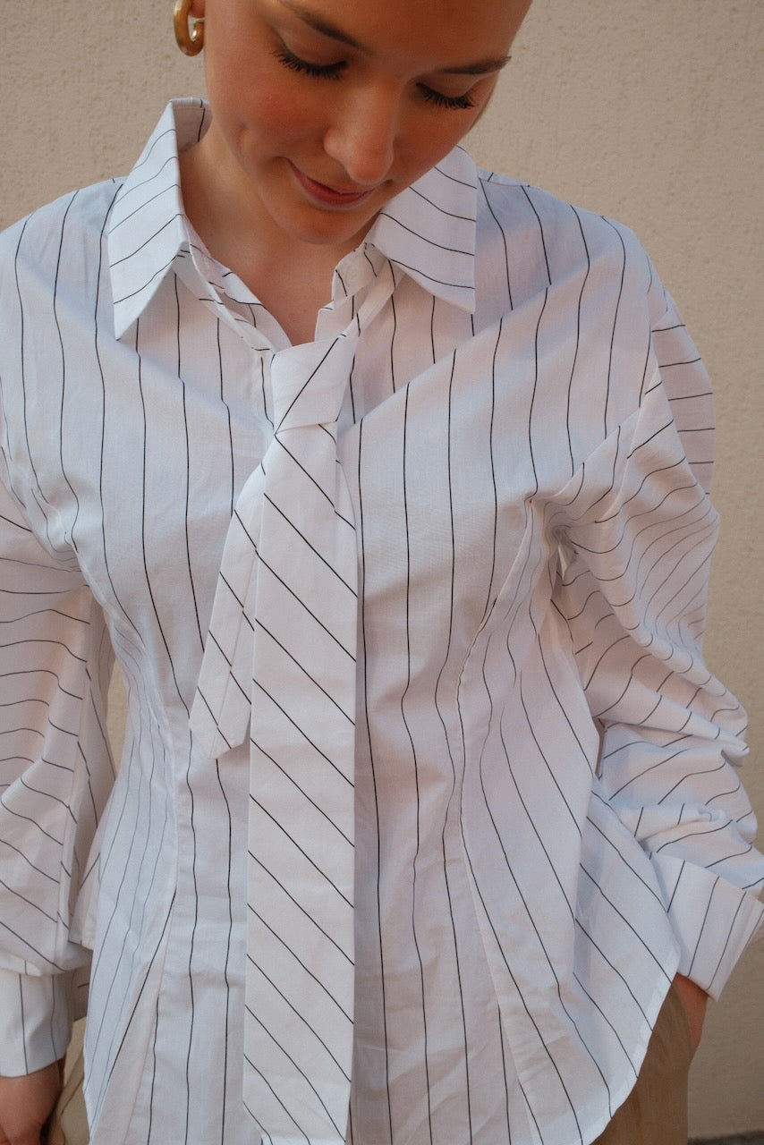 spring collection ’26 FORMA by LDE blouse Maeve is een witte blouse met een elegante krijtstreep die elke taille mooi laat uitkomen. Het ontwerp zorgt voor een slank silhouet en een stijlvolle uitstraling. De blouse is te dragen met of zonder stropdas, afhankelijk van hoe je hem wilt stylen. Een veelzijdig item dat zowel casual als netjes gedragen kan worden. Met deze blouse steel je moeiteloos de show.