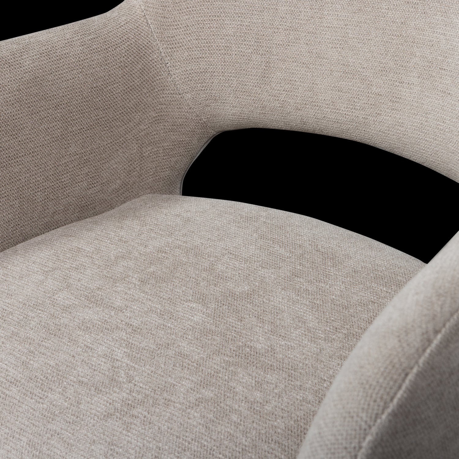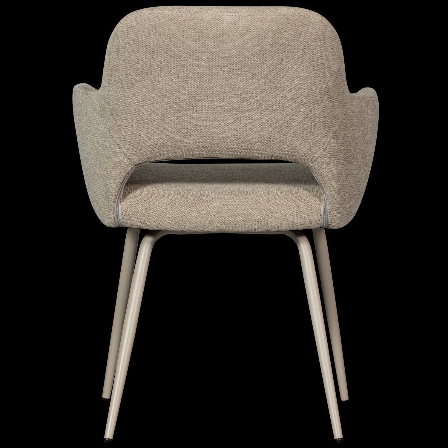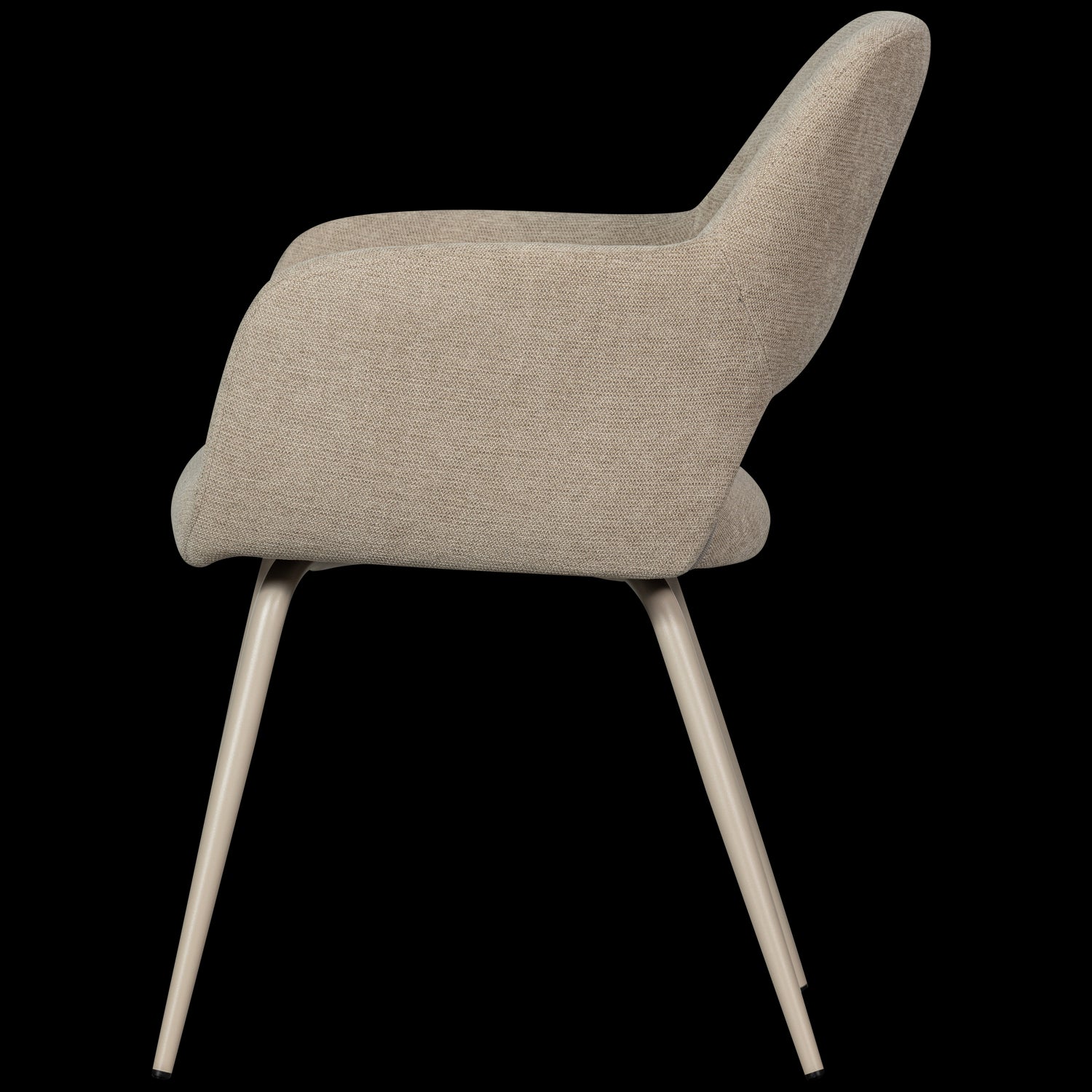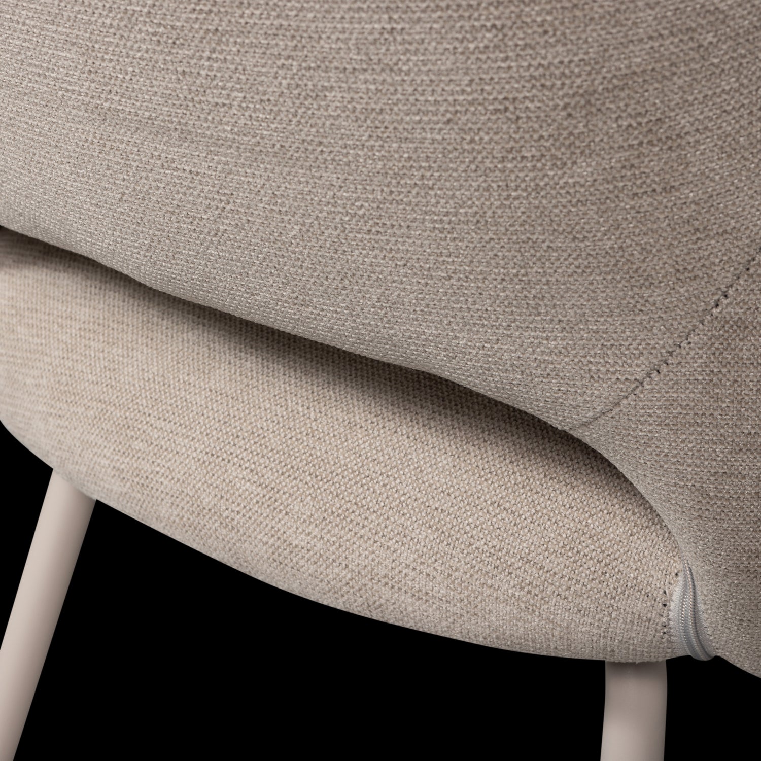 De stoel is bekleed met Hope geweven stof van 100% polyester, die zacht aanvoelt en subtiele kleurnuances heeft. De stof heeft een Martindale-score van 50.000, waardoor deze geschikt is voor redelijk intensief woongebruik. Het onderstel bestaat uit stevige poten met een duurzame constructie.