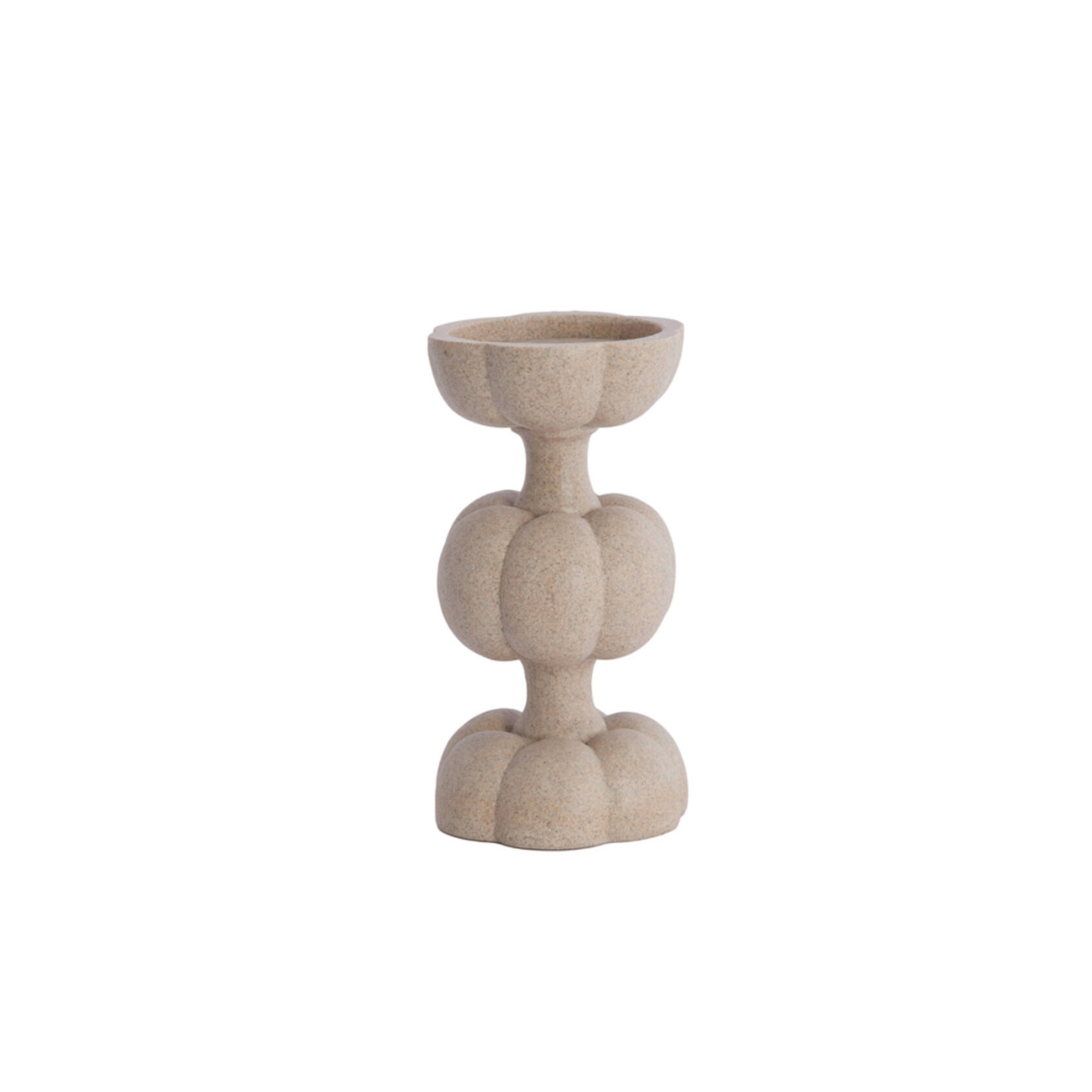 Deze ronde kaarsenhouder in een zand tint voegt direct warmte en verfijning toe aan iedere ruimte. Gemaakt van licht synthetisch materiaal, ideaal voor styling op hogere planken, kasten en sidetables zonder risico op gewicht of valdruk.
