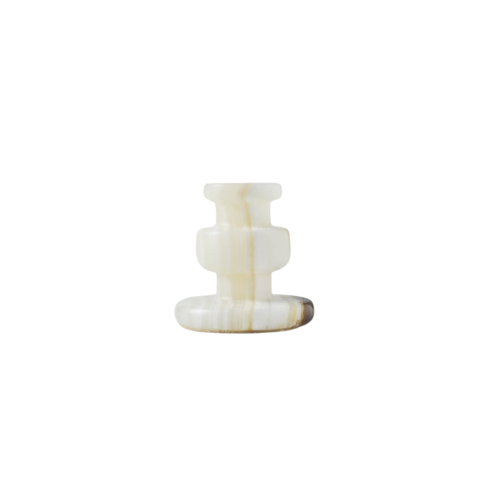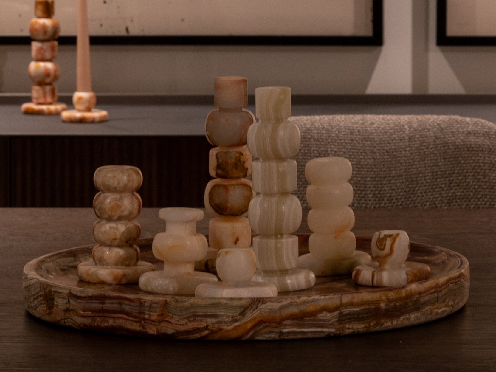 De Zaconi kandelaar is een afgerond kunstwerk, vervaardigd uit onyx. Het vloeiende, gebogen silhouet en de natuurlijke diepte spelen subtiel met het kaarslicht, waardoor een ingetogen warmte en serene sfeer ontstaat in verfijnde interieurs. Dankzij het authentieke karakter van onyx is elk stuk uniek, met eigen variaties in kleur, adering en textuur — een tijdloos statement van natuurlijke elegantie.