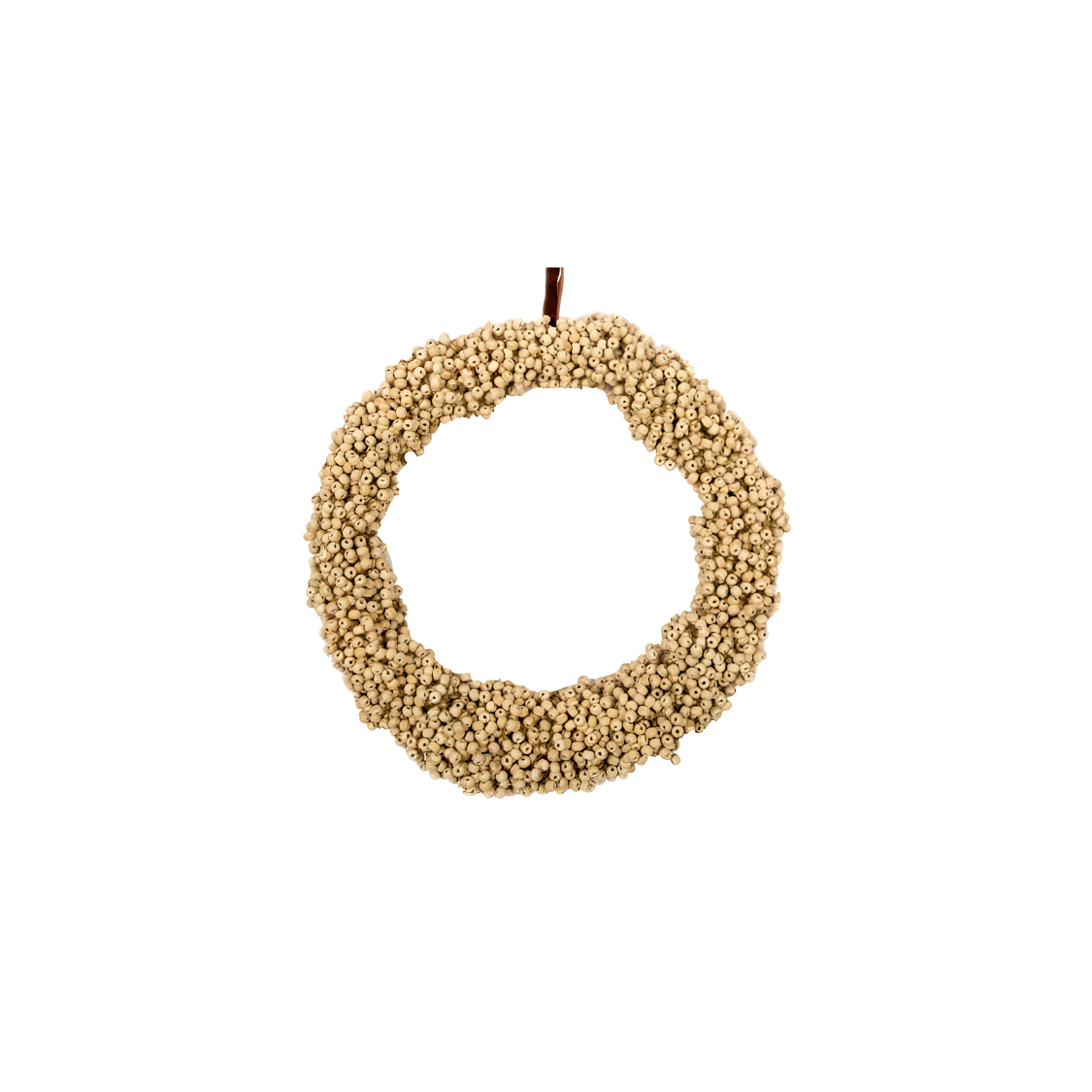 Breng natuurlijke kerstwarmte in huis met de Krans Dina. Deze stijlvolle krans van houten kralen straalt eenvoud en elegantie uit — perfect voor een feestelijke, maar rustige kerstlook.