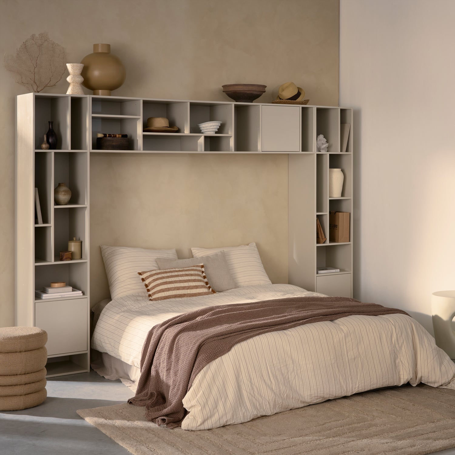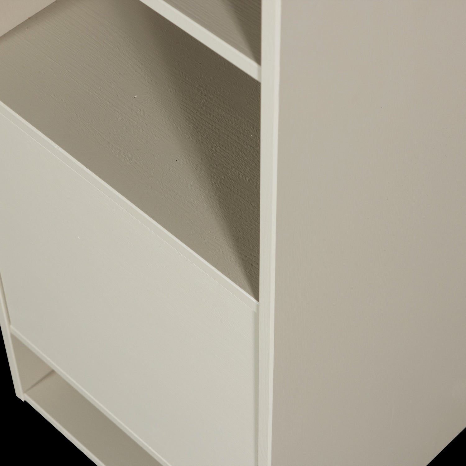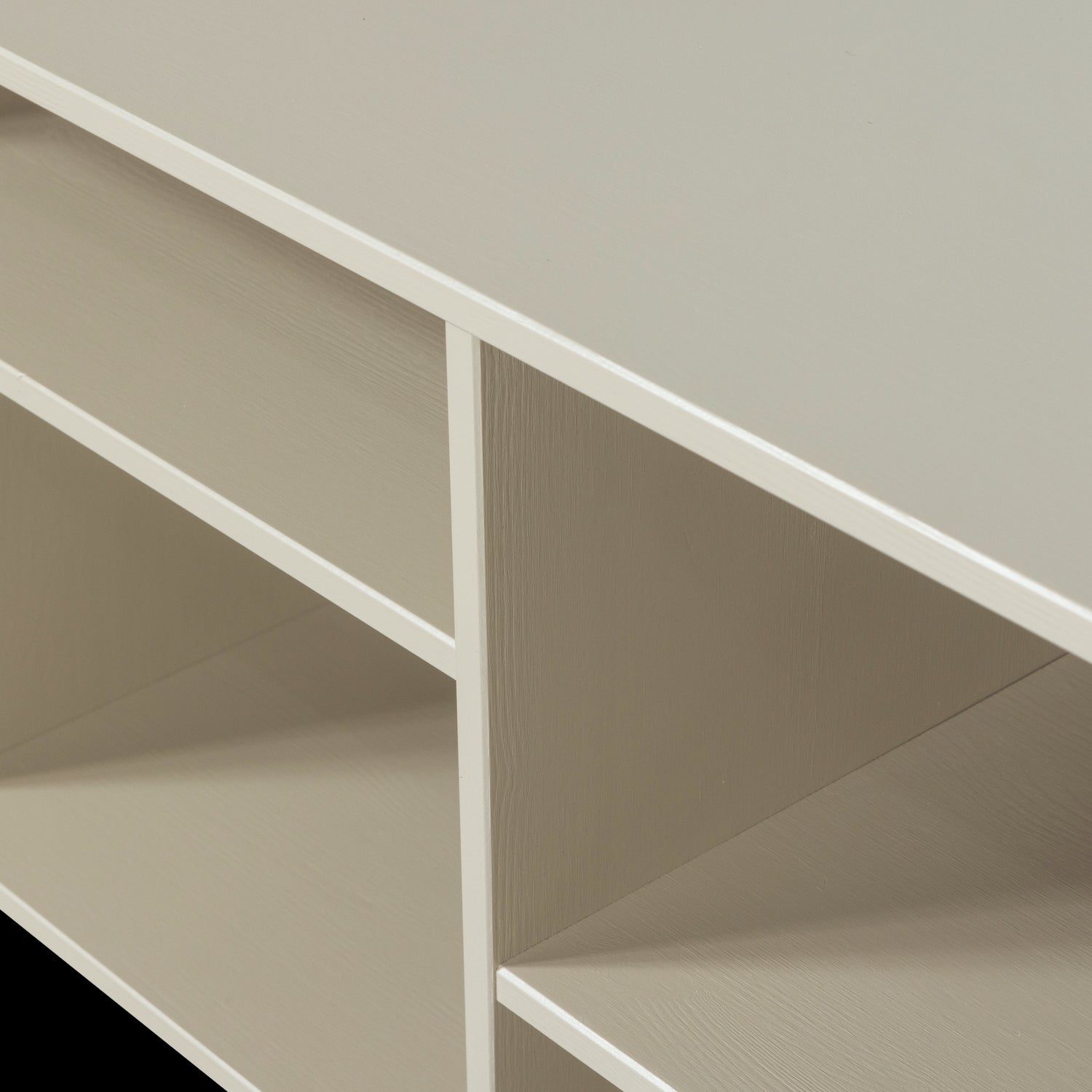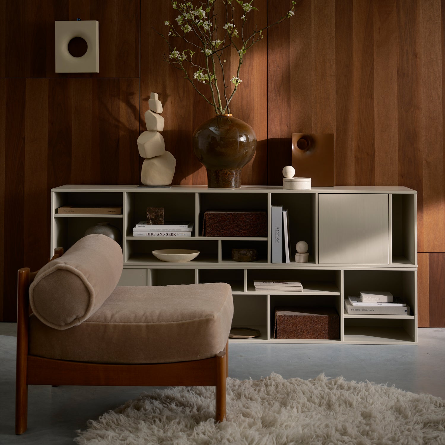 Letterba(n)k wandmeubel – Speels en multifunctioneel wandmeubel uit de collectie van het Nederlandse merk vtwonen, uitgevoerd in FSC-gecertificeerd grenenhout en afgewerkt in de matte kleur dust. Het meubel is flexibel in gebruik en kan zowel horizontaal als verticaal aan de wand worden bevestigd, met diverse open vakken en één gesloten vak met push to open systeem.