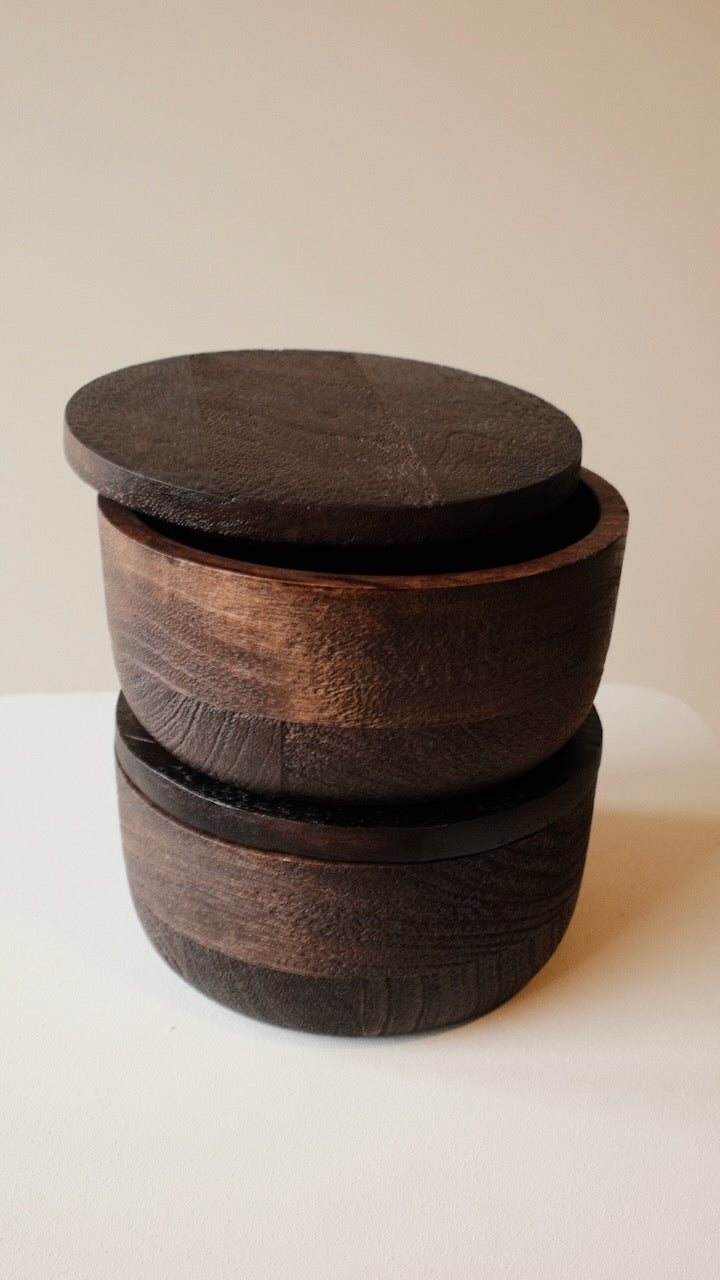 De deco box METETI is een stijlvolle opbergbox van donkerbruin hout met een verfijnde, matte uitstraling. Dankzij het natuurlijke materiaal en de warme kleur vormt deze ronde box een tijdloos en karaktervol accessoire dat moeiteloos past in uiteenlopende interieurstijlen.