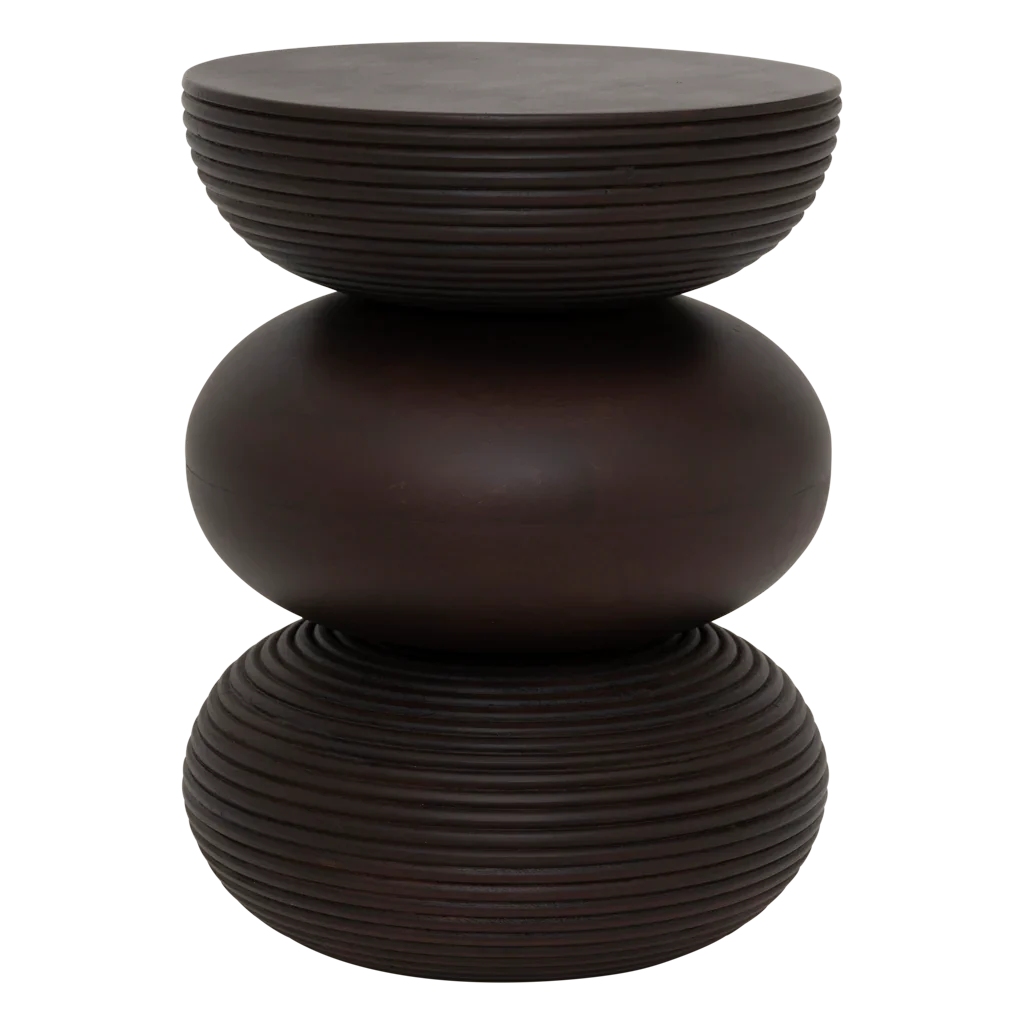 Rond en tactiel: de Sven-tafel van donker walnootkleurig mangohout brengt warmte en textuur dankzij de deels gesneden, bolvormige vorm. Gebruik het als een opvallend accent naast je favoriete leesplek.