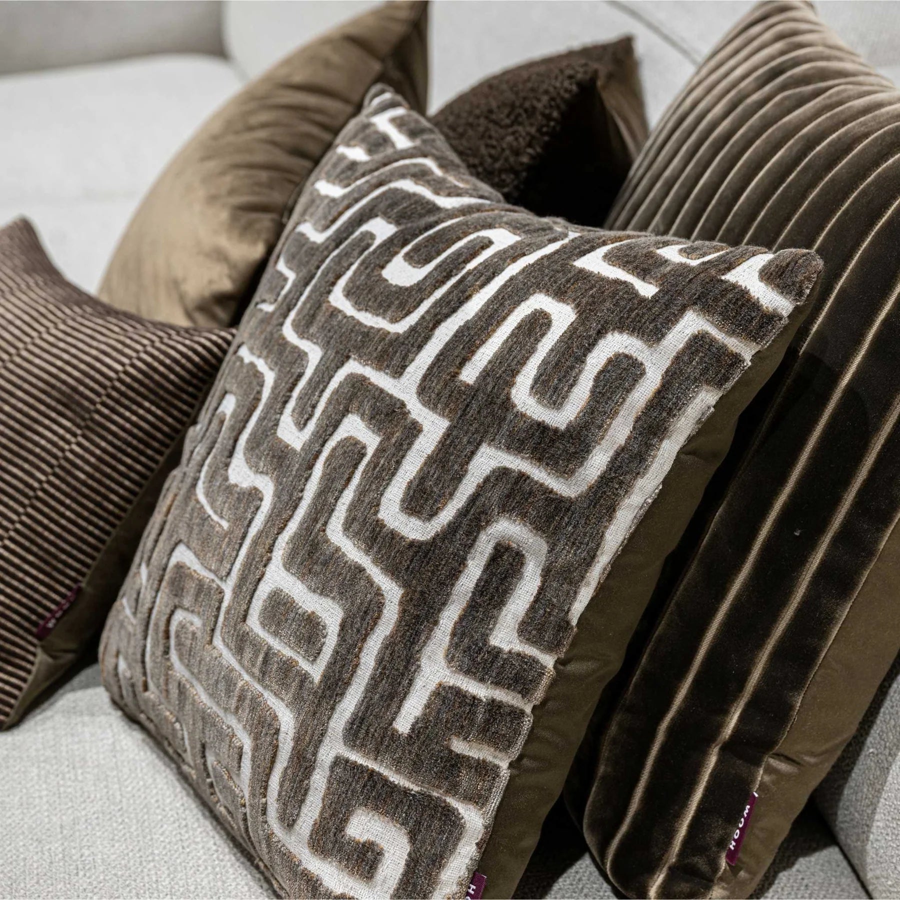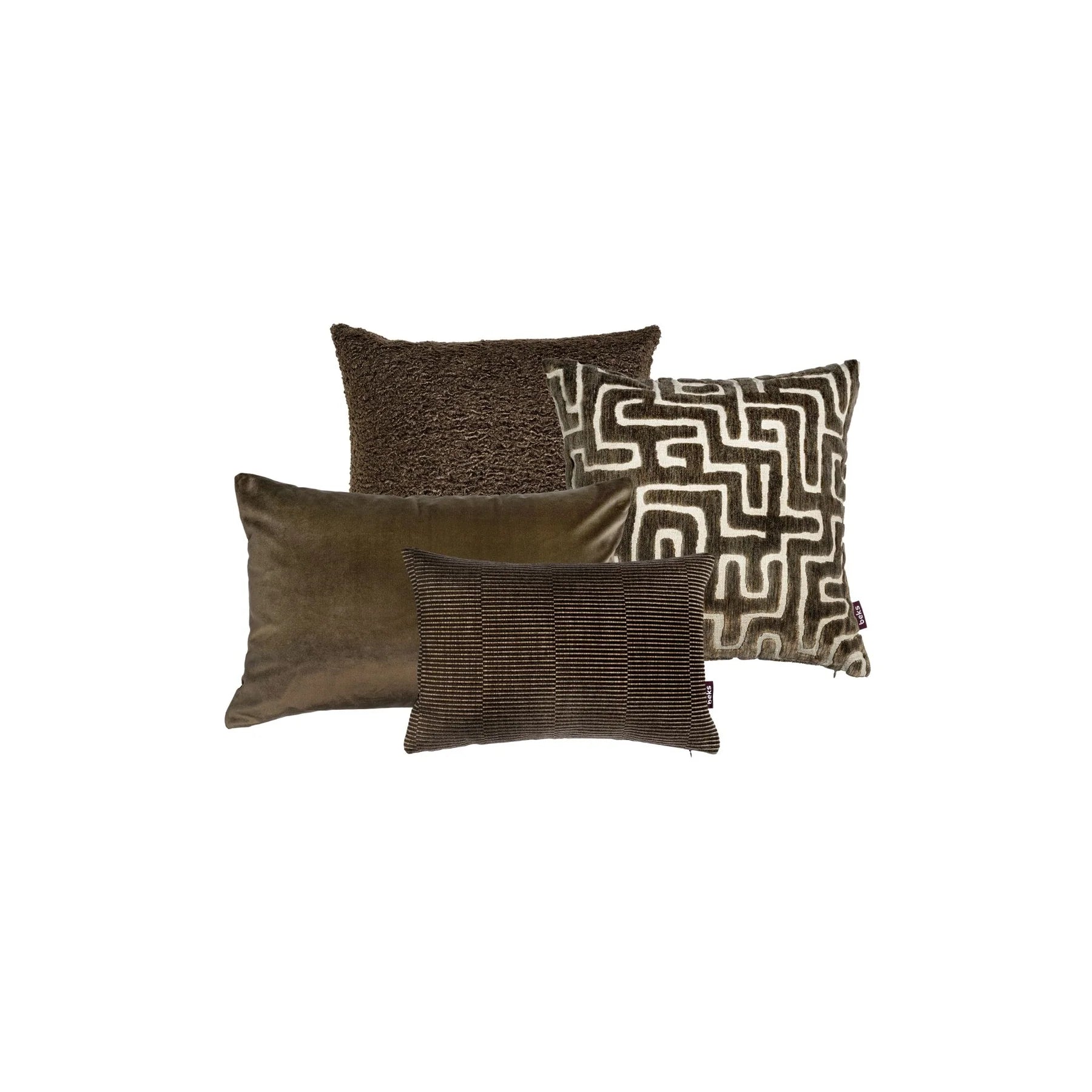 Liam, Roelof, Harvey en Dani vormen samen een diepe, donkerbruine sierkussencombinatie met krachtige uitstraling. De mix van rijke stoffen, speelse patronen en verschillende formaten geeft je interieur een warme, gelaagde basis. Perfect voor wie houdt van balans en karakter.