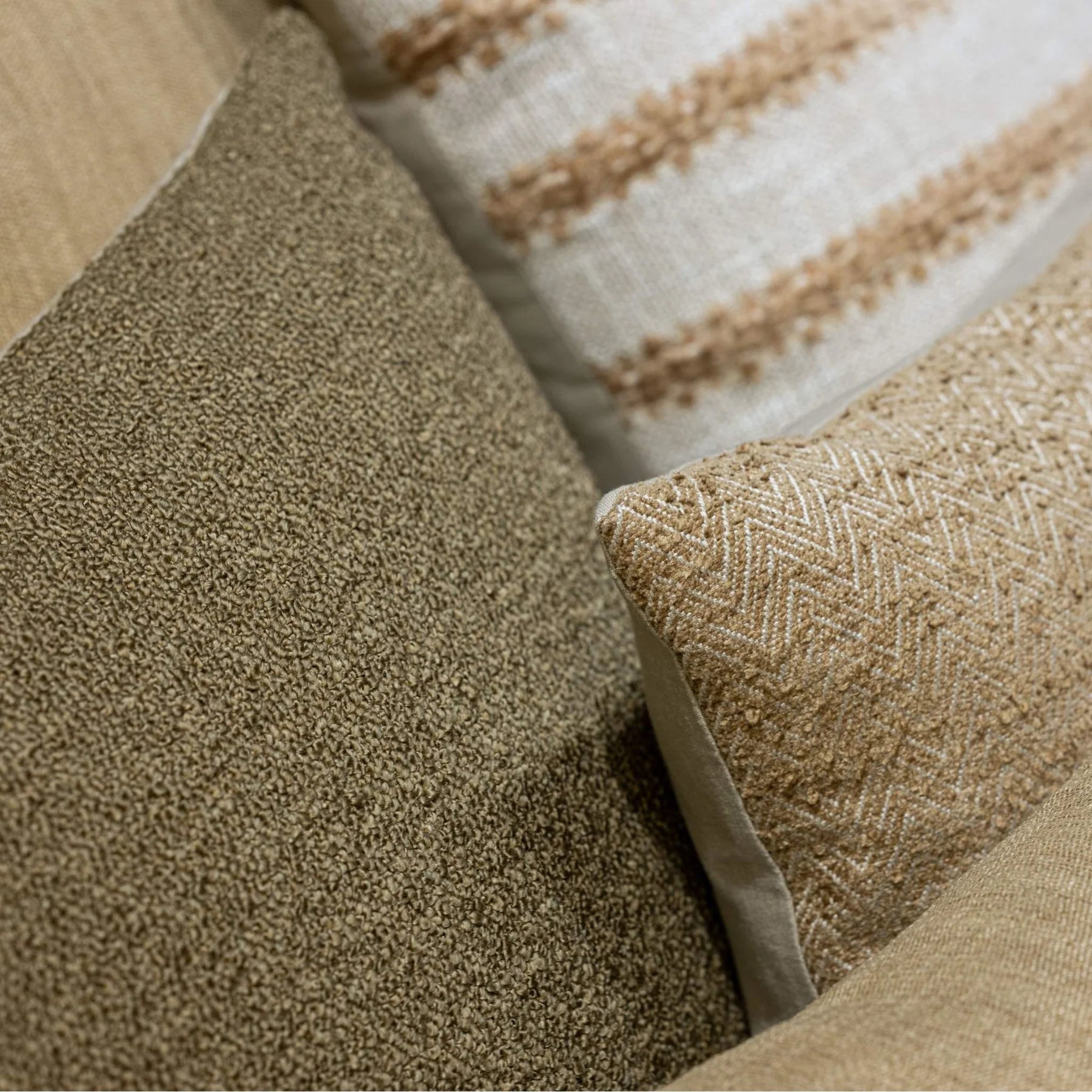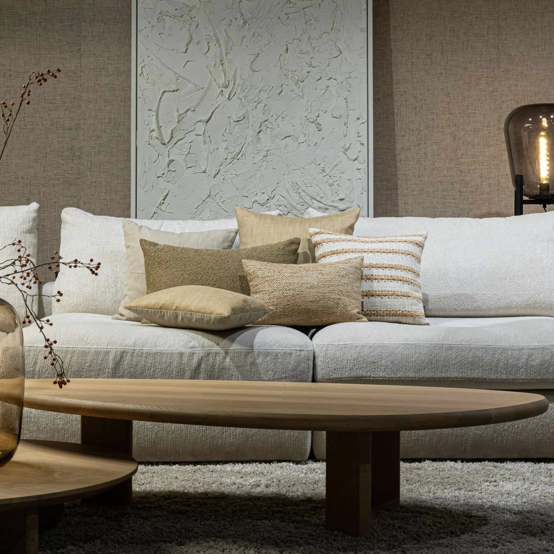 Knud, Jowi, James en Sven vormen samen een luchtige sierkussencombinatie in zandkleurige tinten. De mix van grove en fijne structuren, speelse formaten en natuurlijke kleuren zorgt voor een rustig geheel met textuur en diepte. Perfect als verfijnde basis in elk interieur.