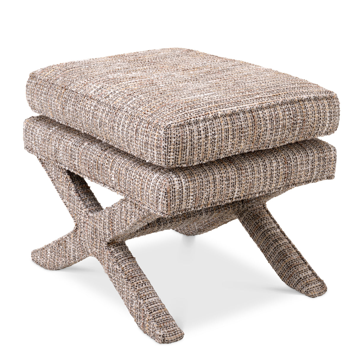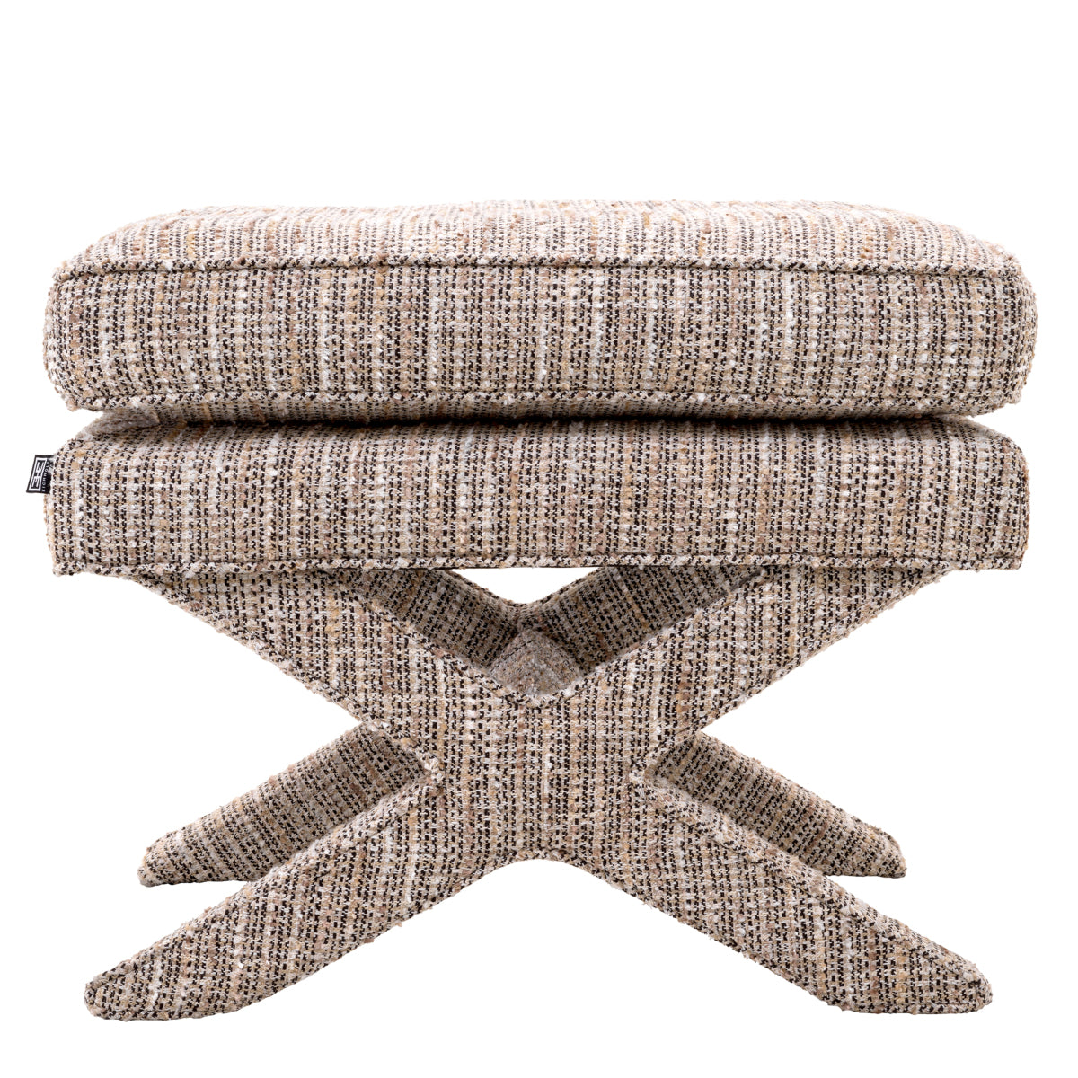Deze elegante poef is volledig bekleed met de zijdezachte Mademoiselle beige stof, wat zorgt voor een luxe en uitnodigende uitstraling. Het compacte ontwerp rust op een stevige kruisvormige basis, wat niet alleen stabiliteit biedt, maar ook een speels, ruimtelijk effect creëert.