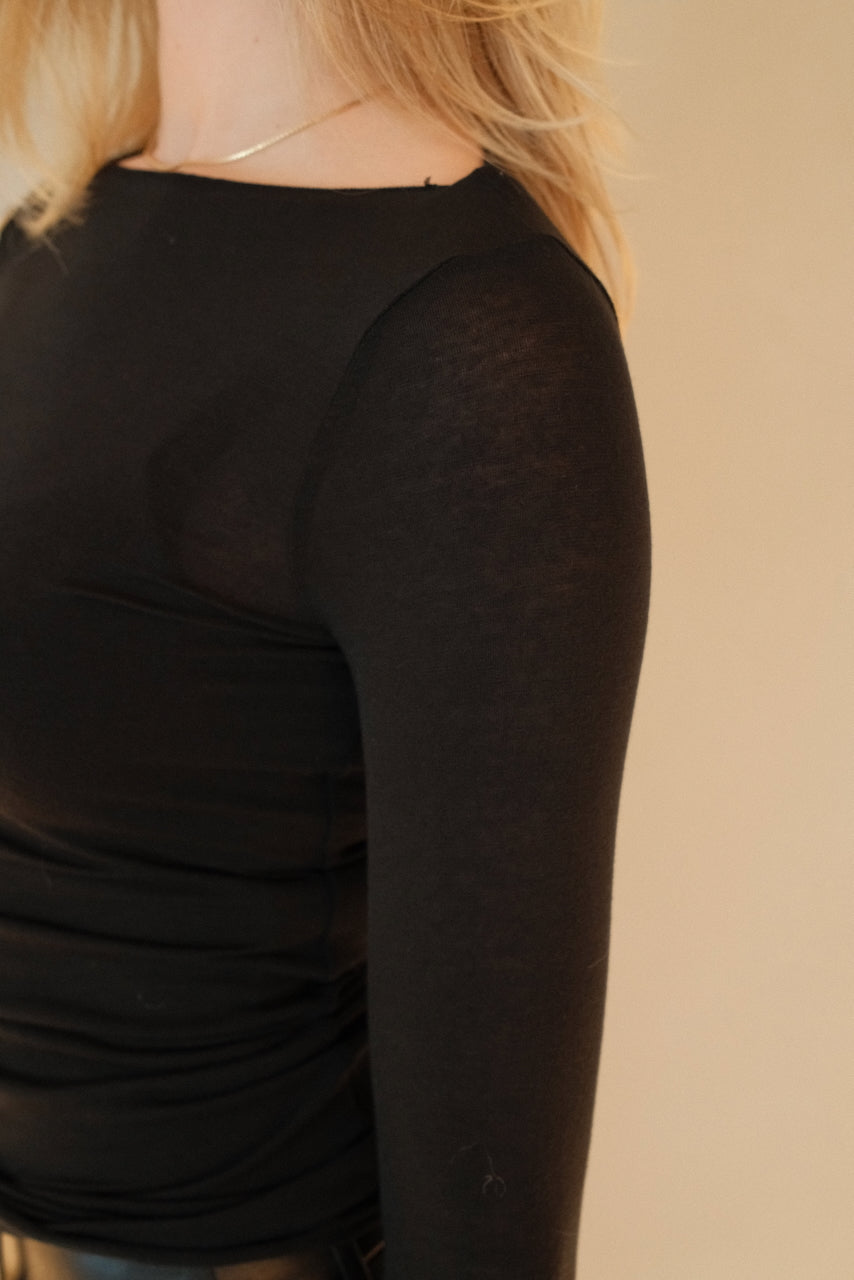 De Top Isa in zwart is een heerlijke basis top voor onder al je vesten en blazers. Gemaakt van 85% modal, 10% cashmere en 5% elastaan, voelt deze top zijdezacht aan en bijna als cashmere. De stof sluit mooi aan en draagt comfortabel. De top is one size en draagbaar van maat XS tot en met M. Een onmisbare basic met een luxe feel voor elke garderobe.