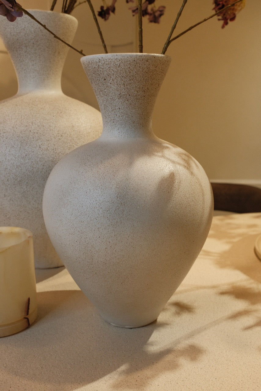De Sulmona vaas in mat crème is een stijlvolle en sfeervolle blikvanger met een rustige, natuurlijke uitstraling. De zachte kleur en de matte keramische afwerking geven de vaas een tijdloos karakter, waardoor hij moeiteloos past in zowel moderne als landelijke interieurs.